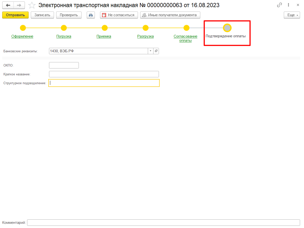 После заполнения каждого этапа участнику перевозки необходимо направить заполненные сведения оператору и другим участникам перевозки, используя кнопку Отправить, расположенную в верхней части титула.