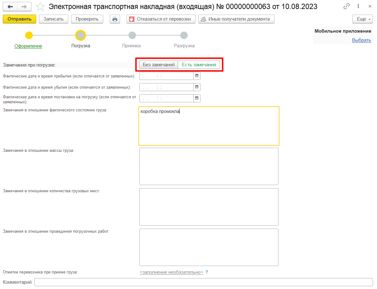 Если перевозчиком были обнаружены несоответствия даты, времени прибытия, убытия, постановки груза на погрузку, либо несоответствия в отношении состояния, массы груза, количества грузовых мест, перевозчик направляет грузоотправителю и грузополучателю подтверждение (информация перевозчика о принятии груза к перевозке) с указанием имеющихся замечаний, используя переключатель «Замечания при погрузке» в положении Есть замечания (рис. 5).