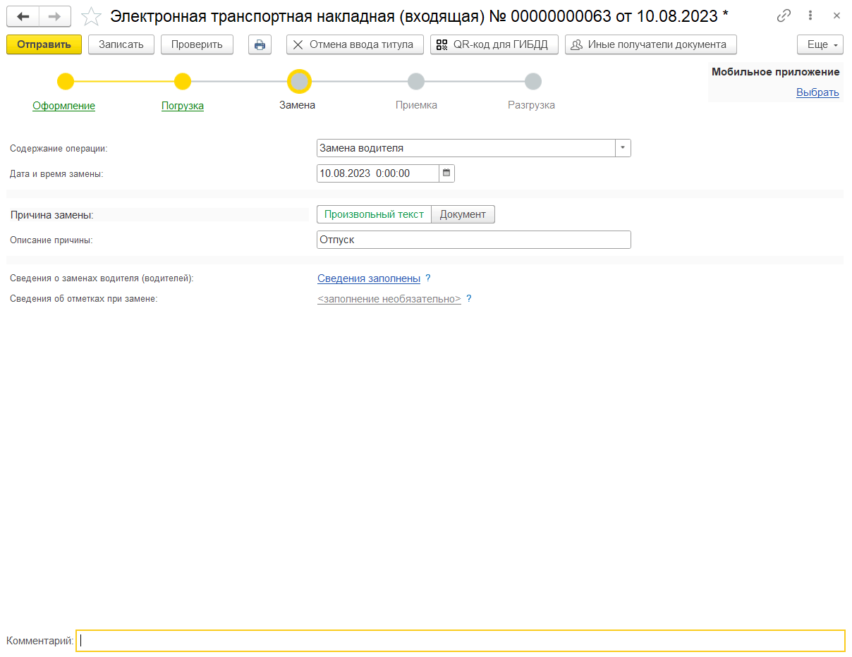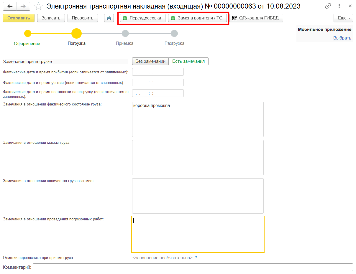 После отправки сведений о переадресовке груза при необходимости перевозчик может внести в электронную транспортную накладную информацию о замене водителя и (или) транспортного средства, используя кнопку Замена водителя/ТС, и направить информацию грузоотправителю и грузополучателю.