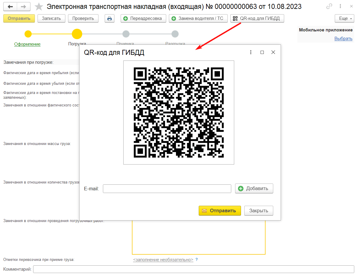 При необходимости перевозчик также может получить QR-код для ГИБДД, который может понадобиться водителю при проверке на дороге. Для получения перевозчику необходимо нажать на кнопку QR-код для ГИБДД (рис.7) и направить код на e-mail водителя, либо сохранить его и направить в любой удобный сервис обмена мгновенными сообщениями.