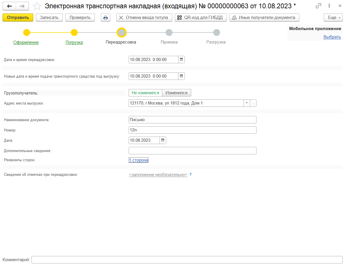 После отправки перевозчиком сведений о переадресовке для нового грузополучателя станут доступны для просмотра сведения об оформлении перевозки и погрузке груза.