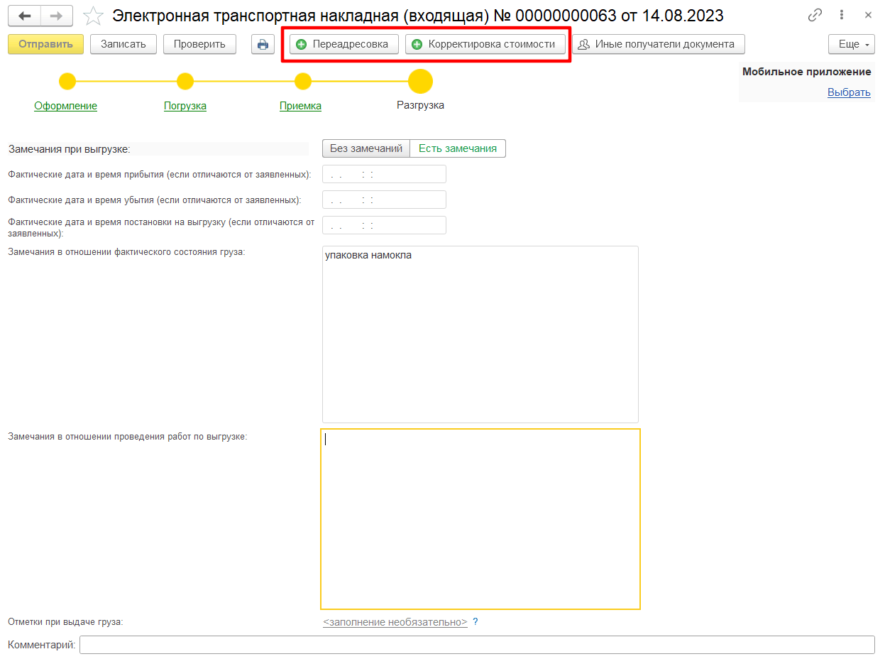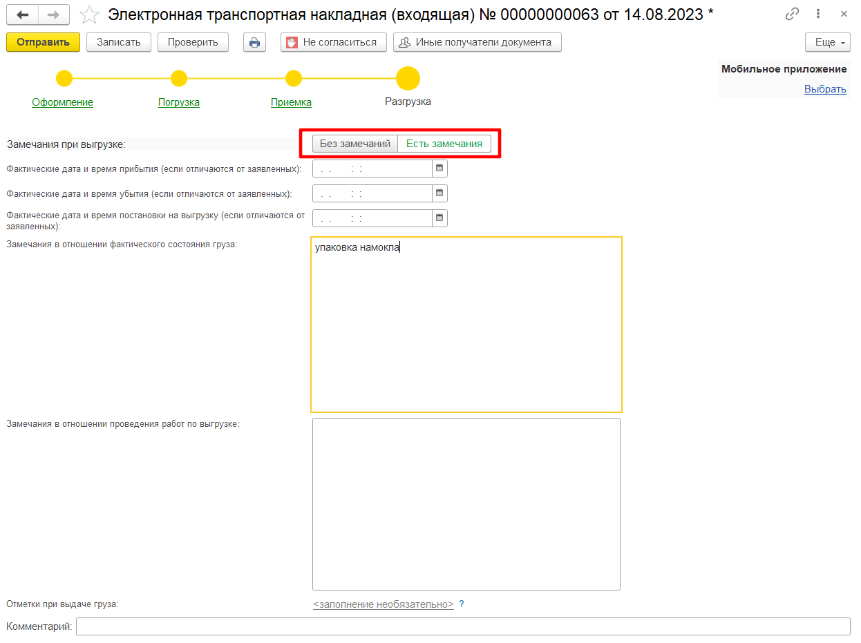 Если перевозчиком были обнаружены несоответствия даты, времени прибытия, убытия, постановки груза на погрузку, либо несоответствия в отношении состояния, массы груза, количества грузовых мест, перевозчик направляет грузоотправителю и грузополучателю подтверждение передачи груза (информация перевозчика о выдаче груза грузополучателю) с указанием имеющихся замечаний, используя переключатель «Замечания при выгрузке» в положении Есть замечания (рис. 10).