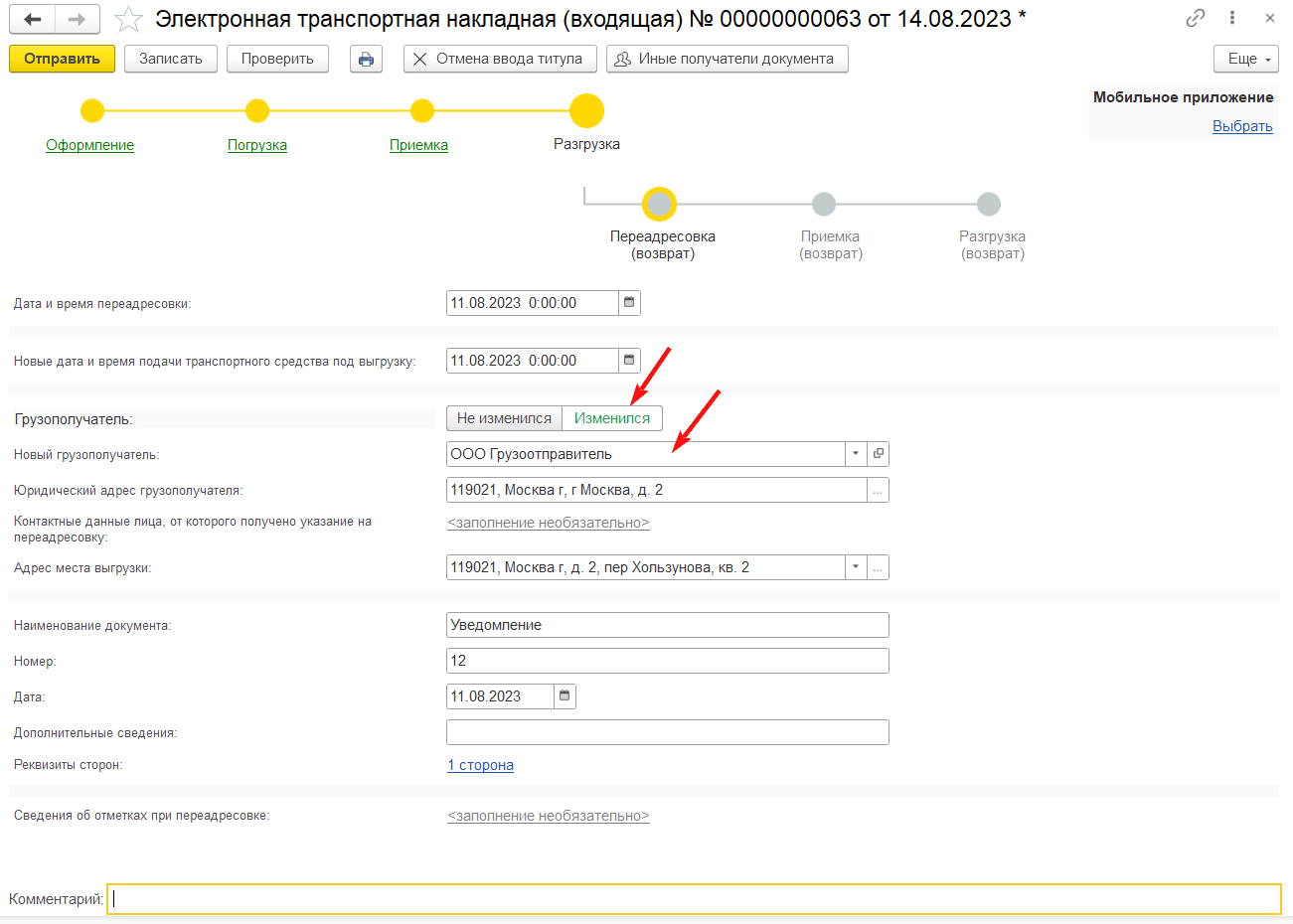 При частичной приемке груза грузополучателем перевозчик на основании уведомления от грузоотправителя или грузополучателя вносит информацию о переадресовке невыгруженного груза с указанием нового адреса выгрузки и (или) нового грузополучателя, используя кнопку Переадресовка.