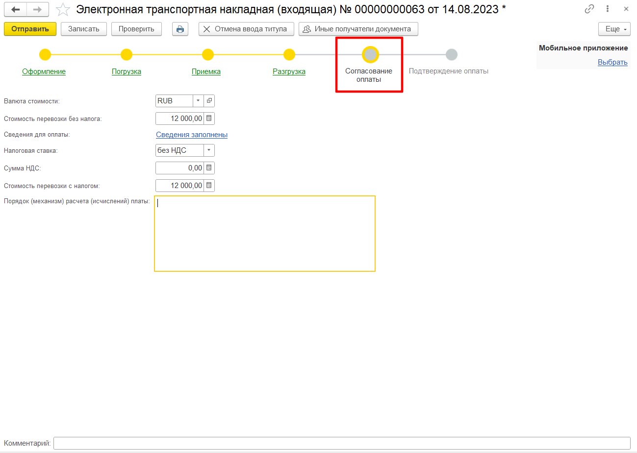 В случае несогласия с указанными перевозчиком сведениями об изменении стоимости перевозки или при необходимости внесения уточнений, грузоотправитель может уведомить об этом перевозчика, используя кнопку Не согласиться.