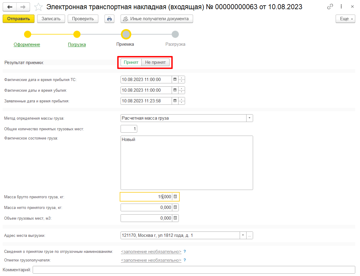 Отказ в приемке груза грузополучатель может оформить, используя переключатель «Вариант приемки» в положении Не принят (рис. 14) с обязательным указанием причин отказа.