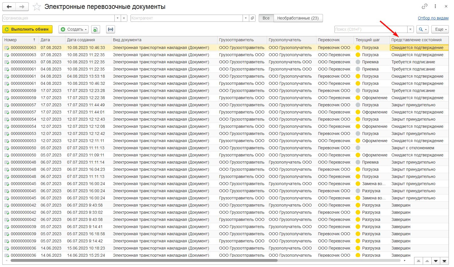 Все статусы состояния отправленных титулов участники перевозки могут отслеживать в строке Представление состояния в списке электронных перевозочных документов (рис. 15).
