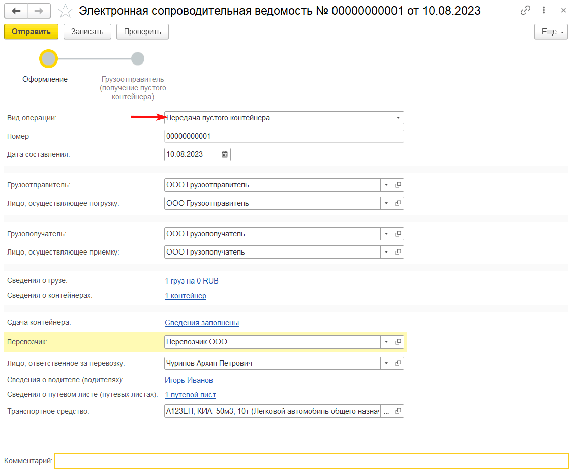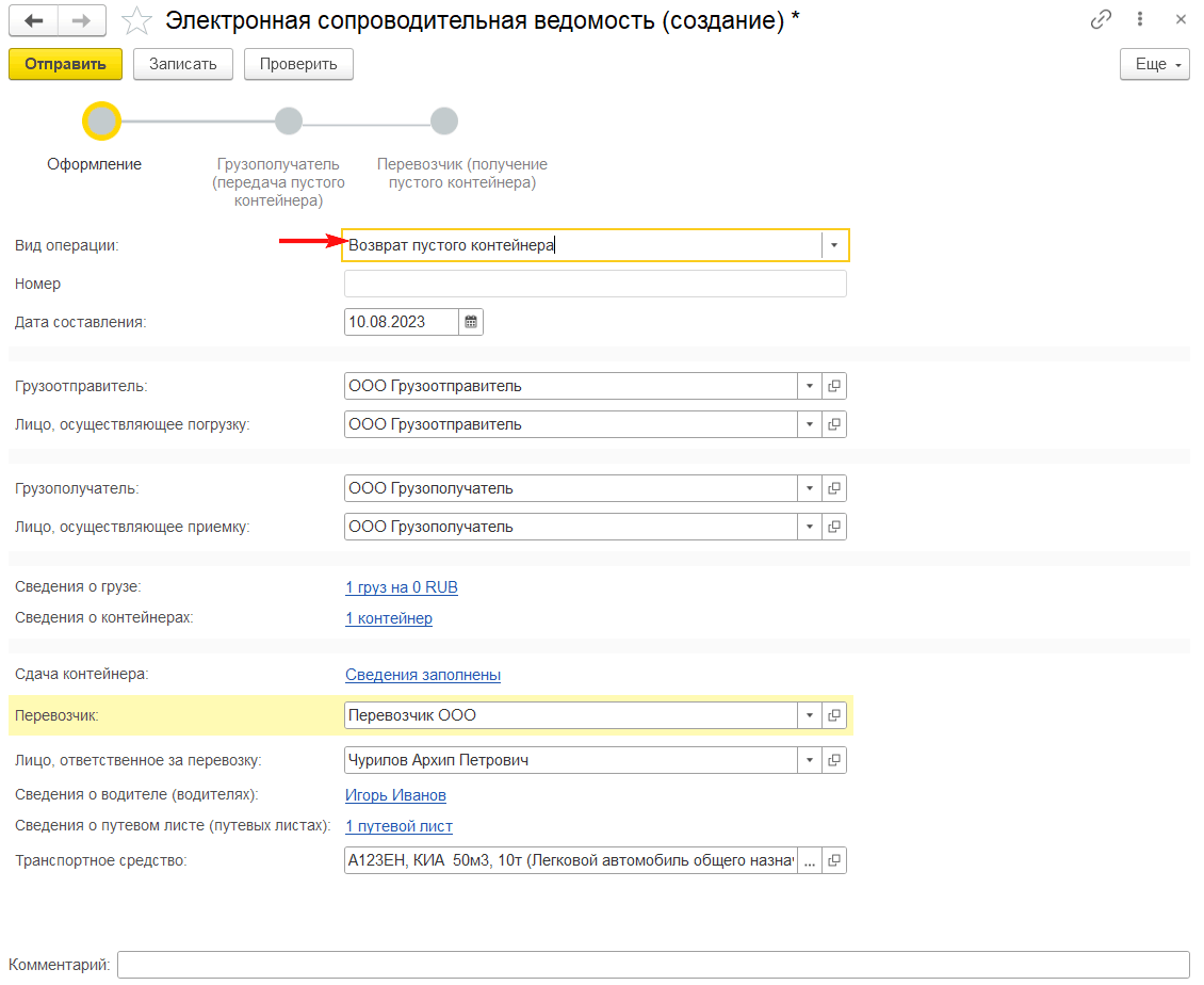 При оформлении электронной сопроводительной ведомости перевозчик вносит все необходимые сведения для возврата пустого контейнера (информация перевозчика). К таким сведениям относятся данные об участниках перевозки (грузоотправителе, перевозчике, грузополучателе), контейнерах, транспортном средстве и иных существенных обстоятельствах перевозки (рис. 19).