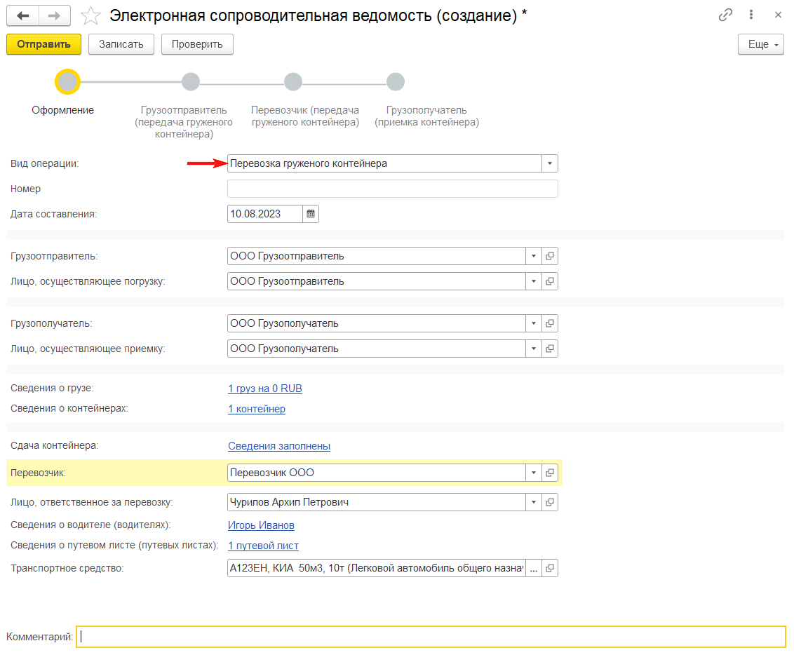 Грузоотправитель в электронную сопроводительную ведомость вносит свои указания к перевозке и сдаче контейнера перевозчику (информация грузоотправителя).