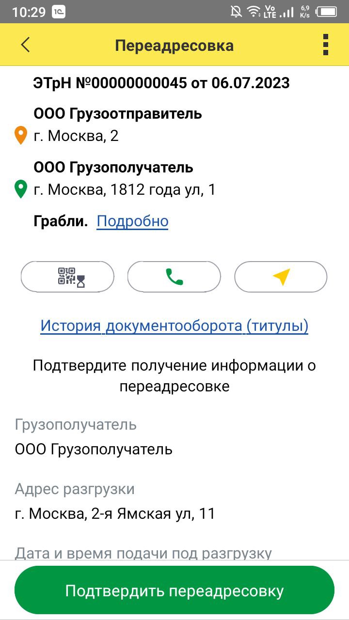 Если во время перевозки грузоотправитель оформит переадресовку груза, водителю на устройство придет уведомление. При этом статус ЭТрН в приложении изменится на значение Переадресовка и водителю необходимо будет подтвердить получение информации о переадресовке (рис.1).