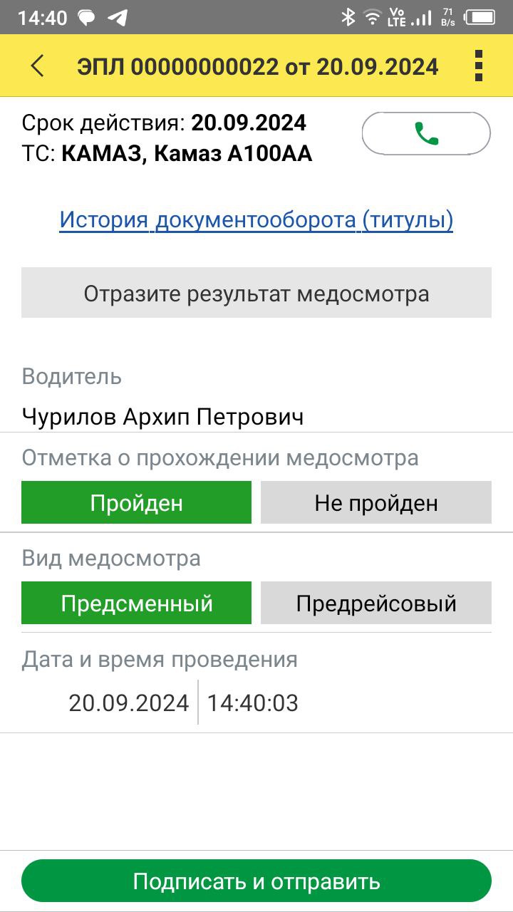 Далее необходимо отразить результаты медосмотра (рис.4). Проставьте отметку о прохождении медосмотра, выберите вид медосмотра. Дата и время прохождения медосмотра заполнятся автоматически, при необходимости их можно скорректировать. После заполнения данных, нажмите кнопку Подписать и отправить.