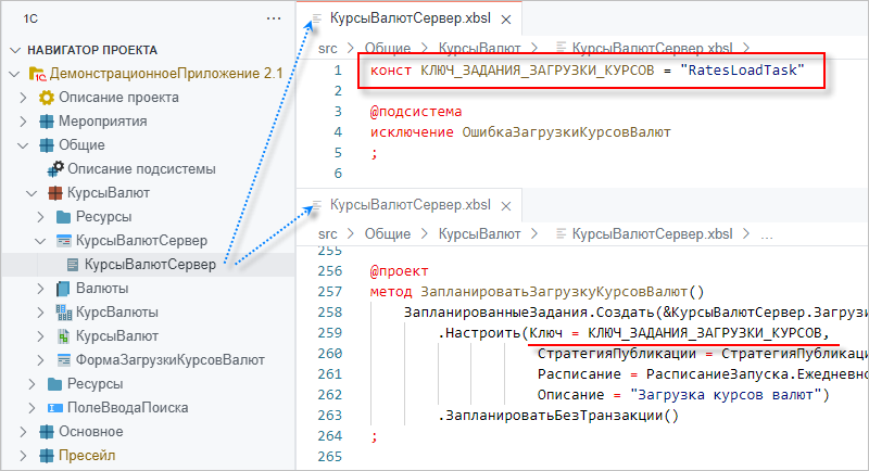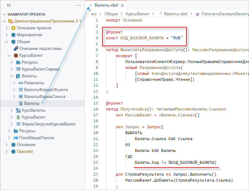 В модуле справочника Общие::КурсыВалют::Валюты объявлена константа КОД_БАЗОВОЙ_ВАЛЮТЫ, которая имеет аннотацию видимости @проект и используется в модуле и за его пределами.