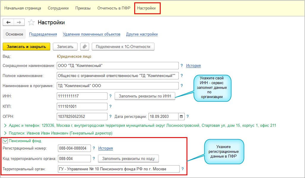 Перед началом работы заполните сведения о работодателе, указав обязательные реквизиты. По кнопке "Заполнить реквизиты по ИНН" сведения будут заполнены автоматически.