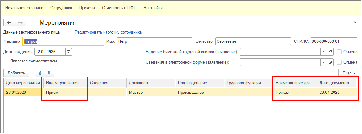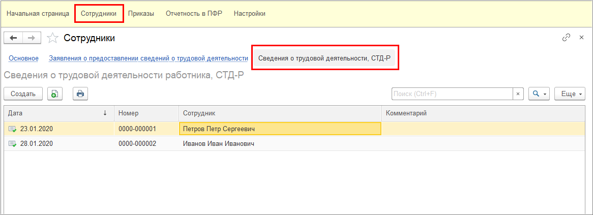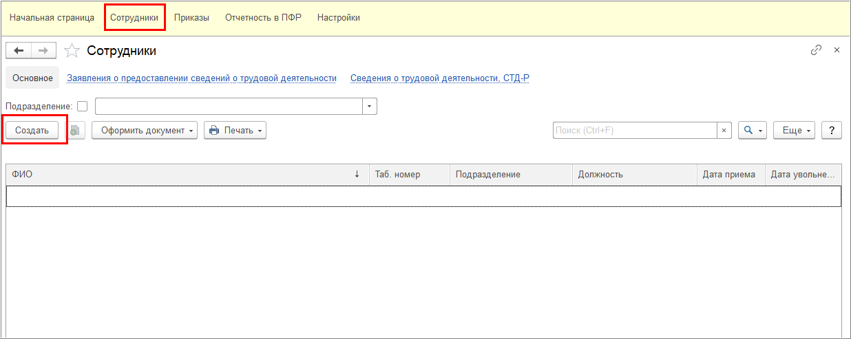 Добавьте новый документ по кнопке "Создать", выберите сотрудника - сведения о его трудовой деятельности заполнятся автоматически.