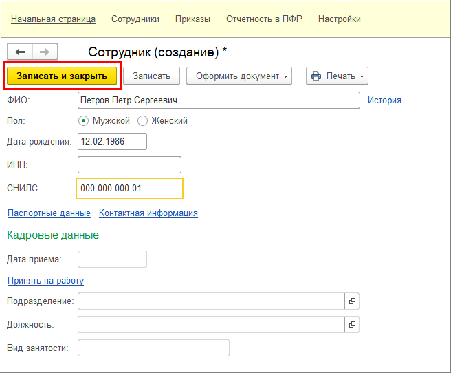 В форме укажите данные нового сотрудника. Обязательными для заполнения являются реквизиты ФИО, Дата рождения и СНИЛС, т.к. эти данные передаются в составе СЗВ-ТД. После ввода данных, нажмите кнопку "Записать и закрыть".