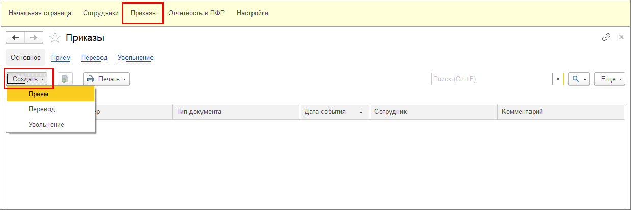 Все кадровые документы организации по всем сотрудникам доступны в разделе Приказы.