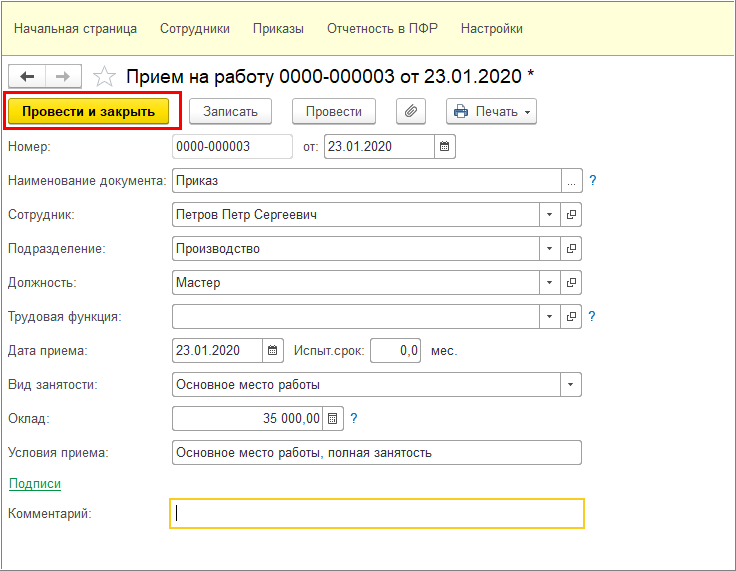 23.01.2020 г. в ООО "ТД "Комплексный" принят на работу Петров Петр Сергеевич на должность мастера с окладом 35 000 руб. в мес.