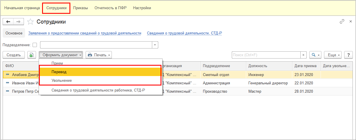 Перемещение или увольнение сотрудников оформите в разделе Сотрудники подменю Оформить документ. Выделите нужного сотрудника и выберите кадровое событие.