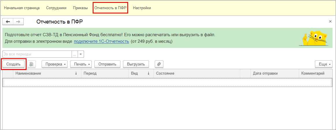 Раздел Отчетность в ПФР, кнопка "Создать".