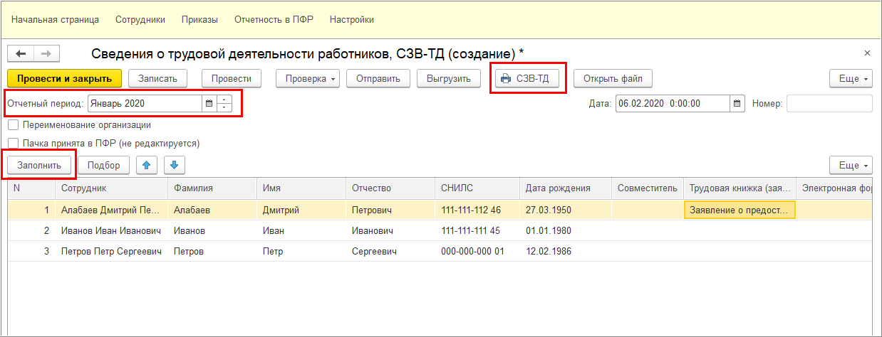 Рис.8 Заполнение отчета по форме СЗВ-ТД за январь 2020 г.