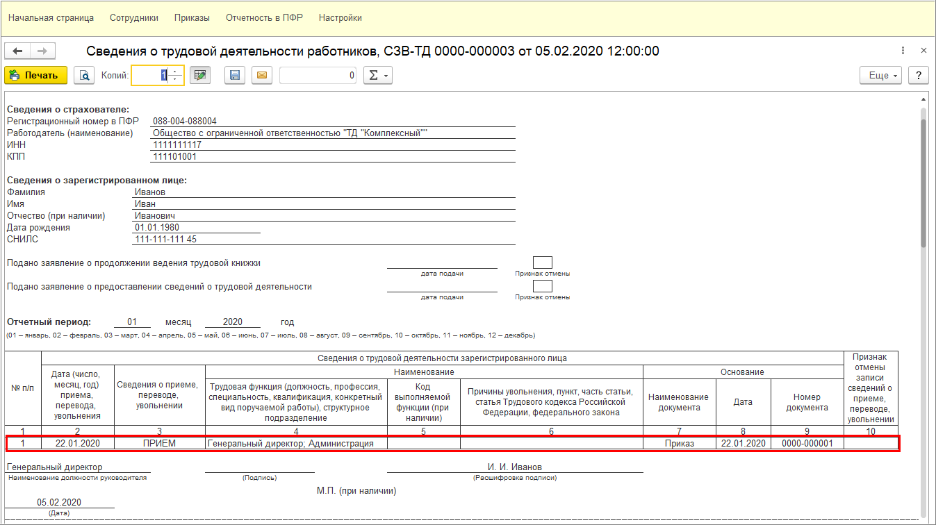 Рис.10 Печатная форма отчета СЗВ-ТД за январь 2020 г.