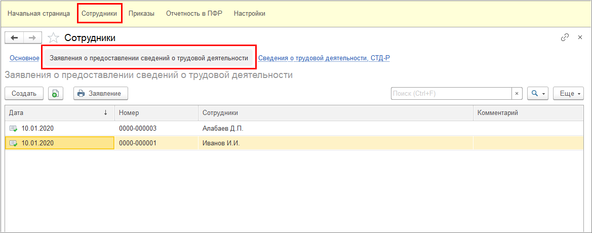 Эту информацию нужно отразить в программе. Для регистрации заявления введите документ "Заявление о предоставлении сведений о трудовой деятельности" из раздела Сотрудники. Данные этого документа включаются в отчет СЗВ-ТД вместе с кадровыми изменениями.