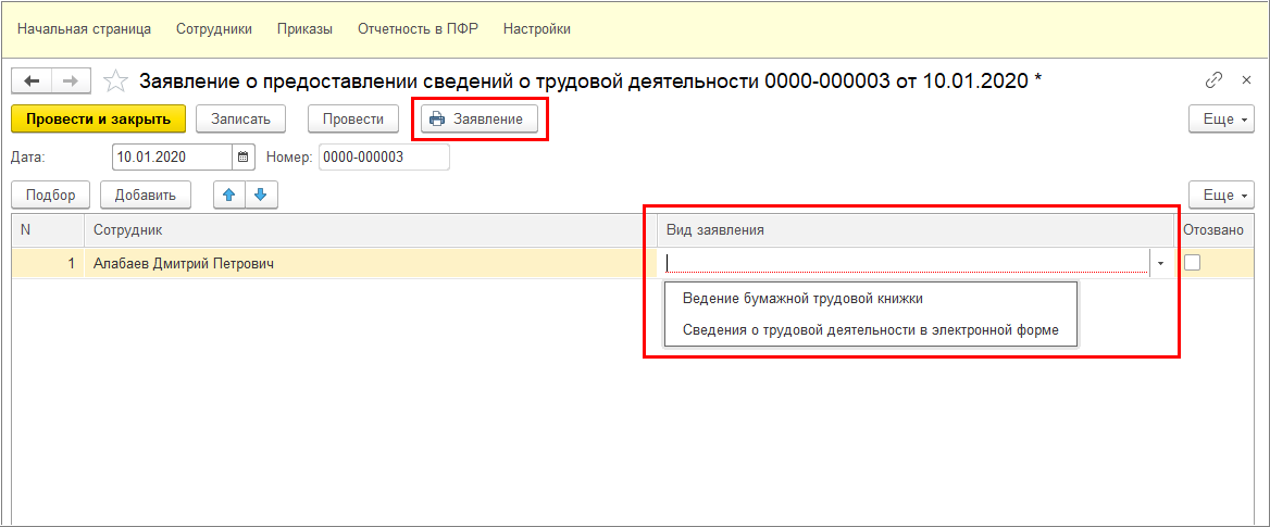 Нажмите кнопку "Создать", чтобы зарегистрировать новые заявления. В окне заявления выберите нужного сотрудника и выбранный им способ ведения трудовой книжки. Из формы возможно распечатать само заявление и подписать у сотрудника.