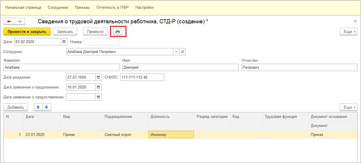 После заполнения формы СЗВ-ТД, нажмите кнопку "Провести". Из формы возможно распечатать отчет, который надо подписать и представить в ПФР.