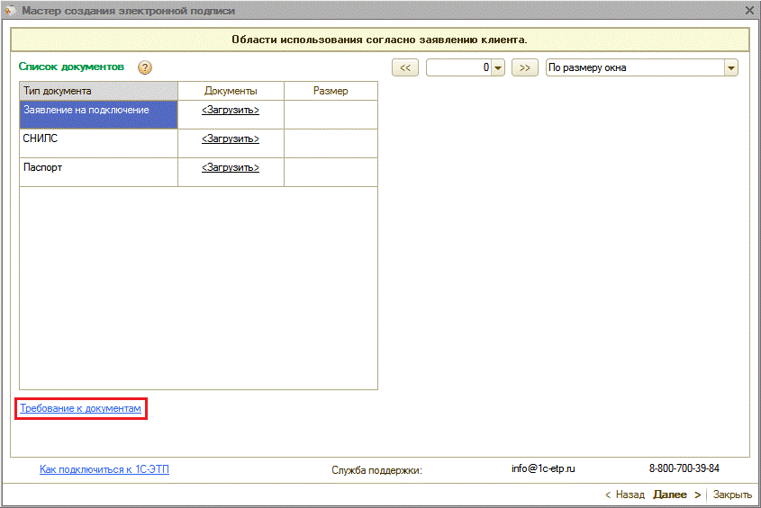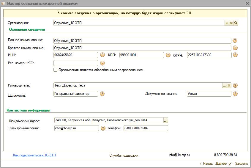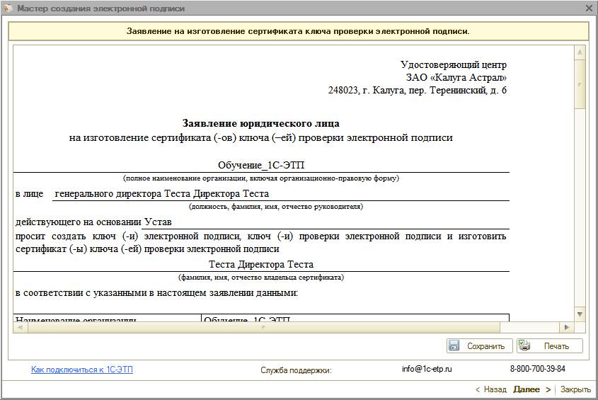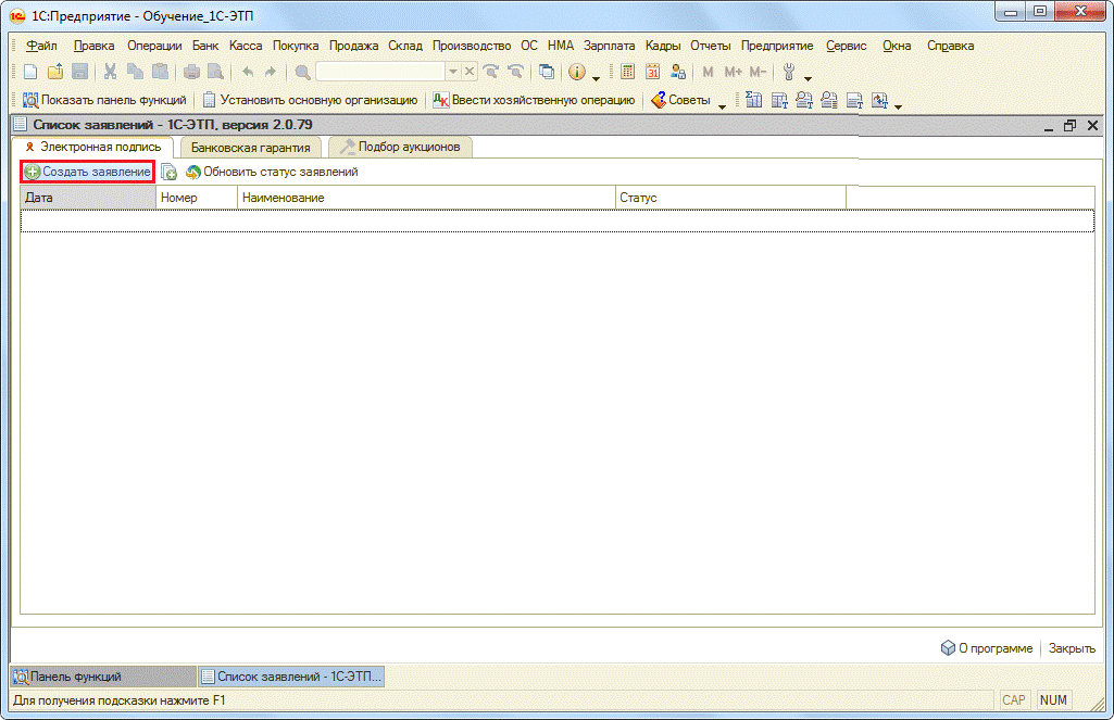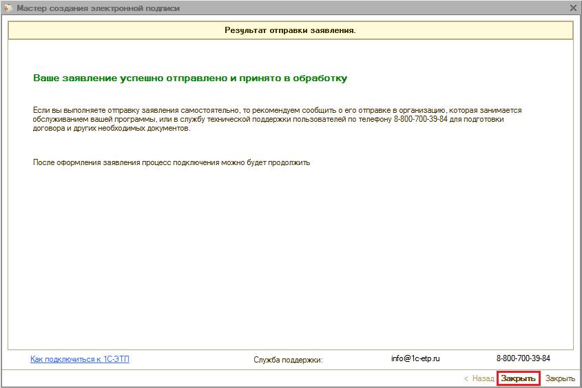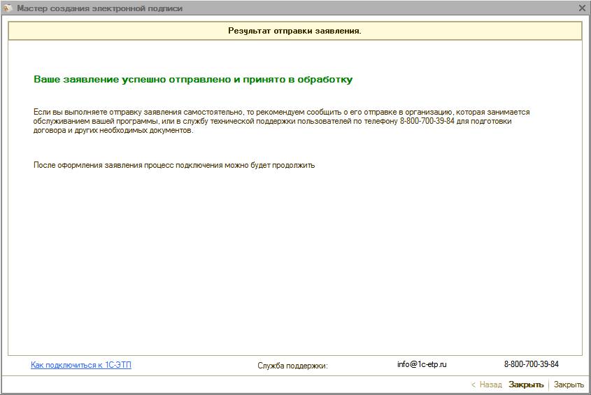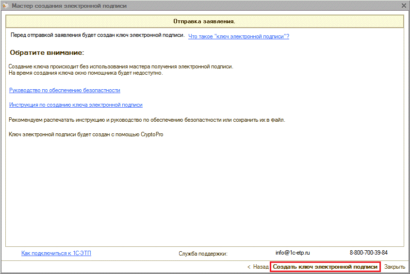 Для получения электронной подписи необходимо сформировать и отправить заявление из ПП «1С-ЭТП» с помощью «Мастера получения электронной подписи».