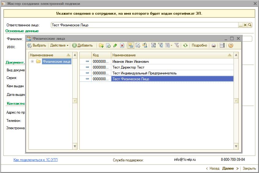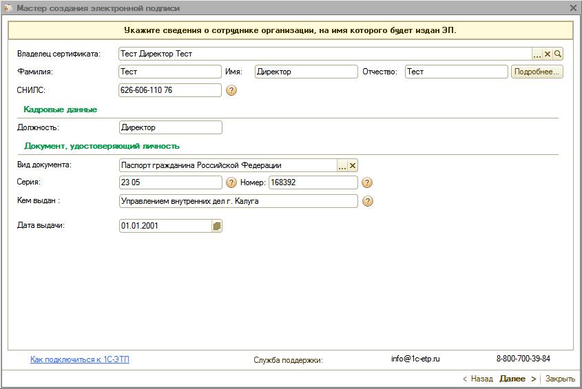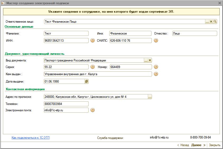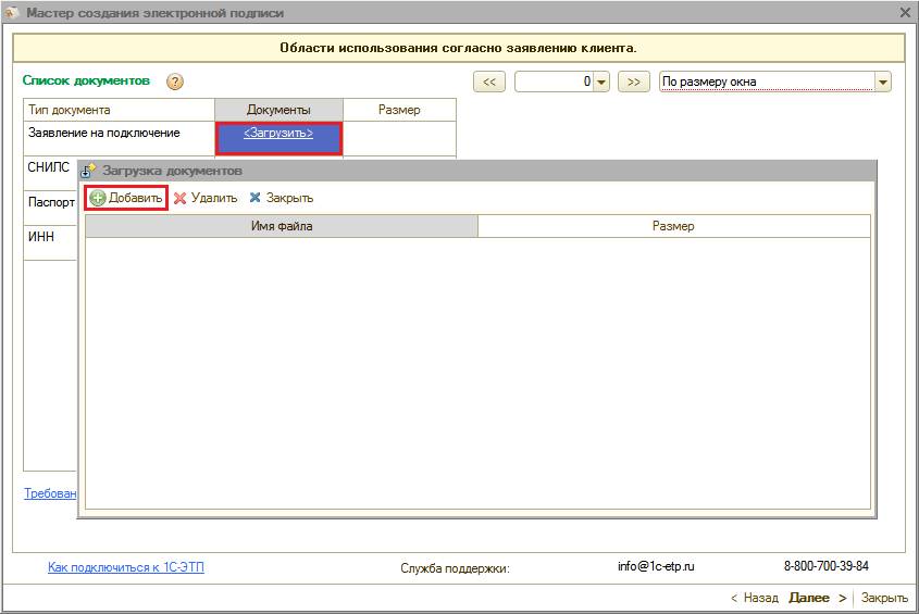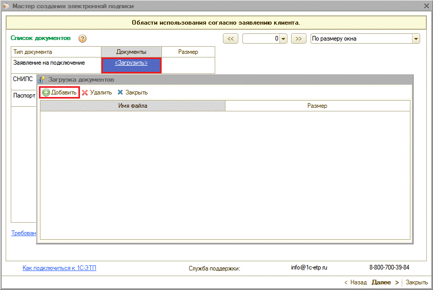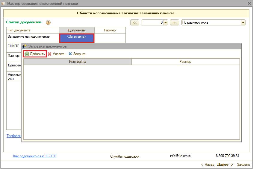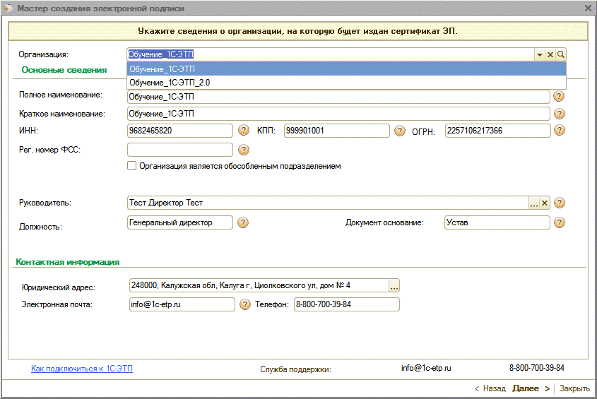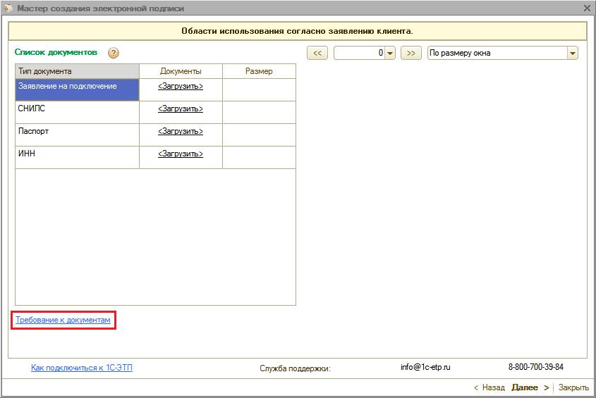 Для получения электронной подписи необходимо сформировать и отправить заявление из ПП «1С-ЭТП» с помощью «Мастера получения электронной подписи».