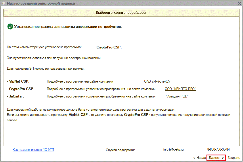 СКЗИ будет использоваться для выполнения криптографических функций при формировании электронной подписи, при дальнейшей работе на электронных торговых площадка, государственных порталах и при использовании ЭП в электронном документообороте. Работа ПП «1С-ЭТП» возможна совместно с СКЗИ КриптоПро CSP или VipNet CSP, для корректной работы допустимо наличие только одного криптопровайдера установленного на компьютер.