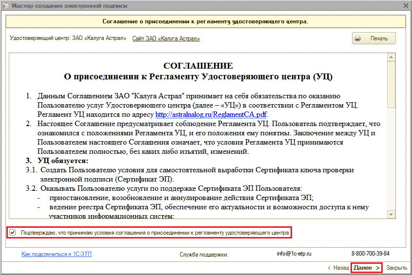 На следующем шаге необходимо принять Соглашение о присоединении к регламенту Удостоверяющего центра. Проставьте отметку «Подтверждаю...» и нажмите кнопку «Далее» (рис. 3.4.).