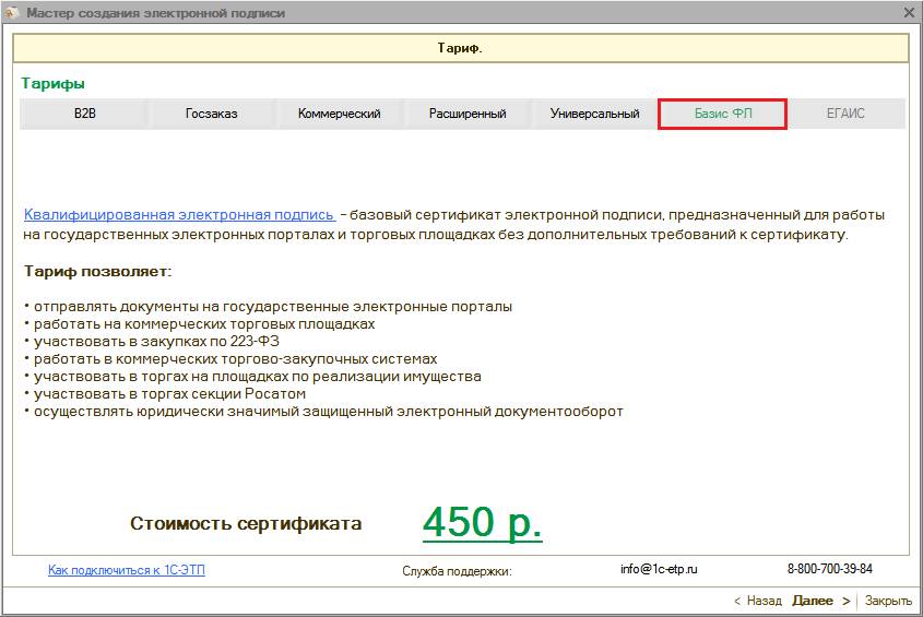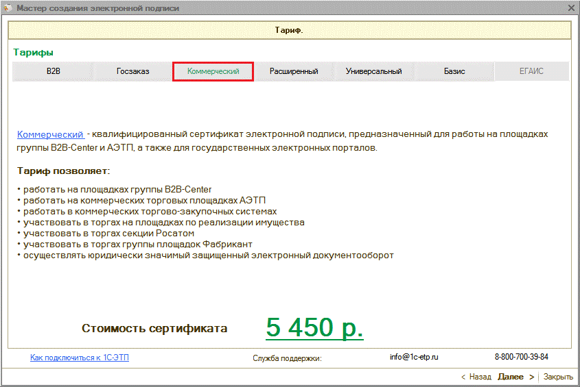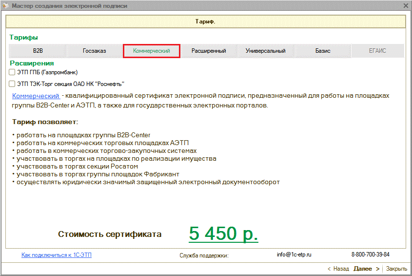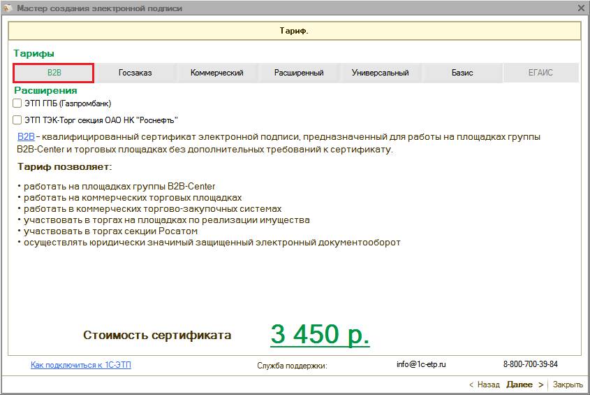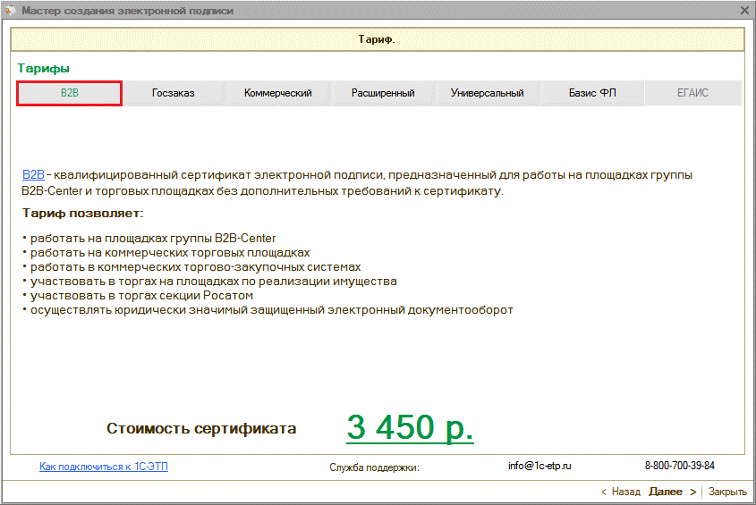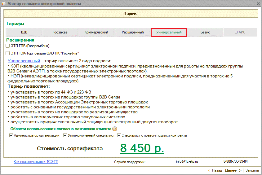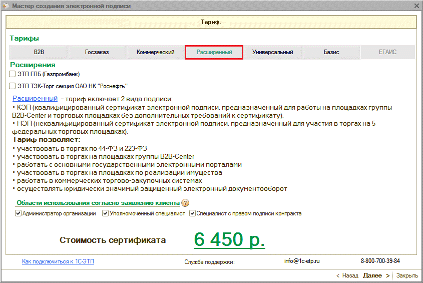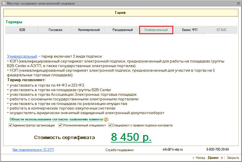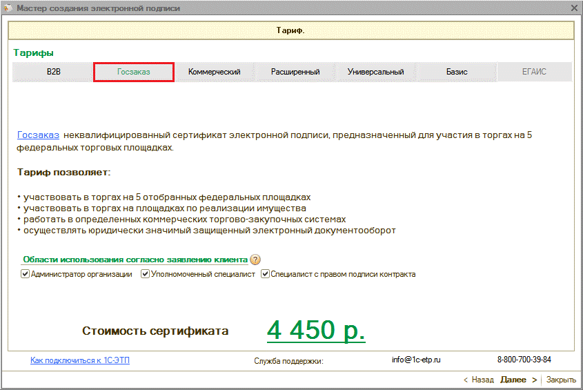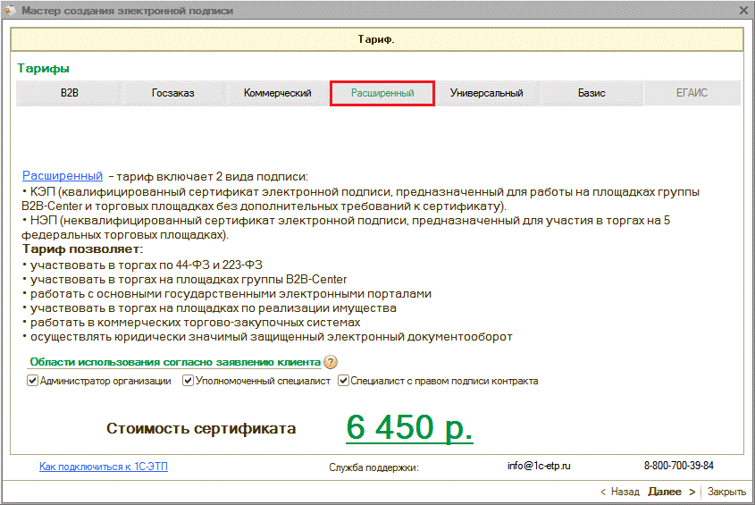 Области действия электронных подписей согласно действующим тарифам более подробно представлены на сайте www.1c-etp.ru в разделе «Электронная подпись» - «Тарифы». |