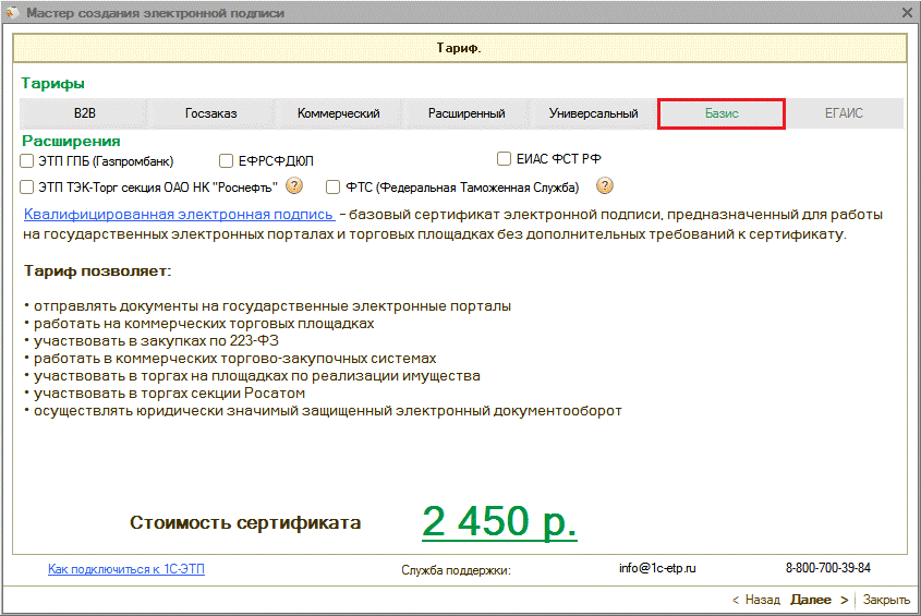 Выберите тариф, в зависимости от тарифа и выбранного ранее СКЗИ изменится область применения электронной подписи, ее стоимость и дополнительные расширения.