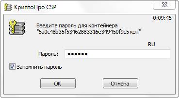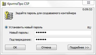Следующим этапом откроется окно ввода пароля для ограничения доступа к контейнеру закрытого ключа (рис. 3.2.17). Пароль должен содержать в себе не менее 6 символов, при необходимости Вы можете отметить пункт «Сохранить пароль». Для продолжения работы нажмите кнопку «ОК» (рис. 3.2.18).