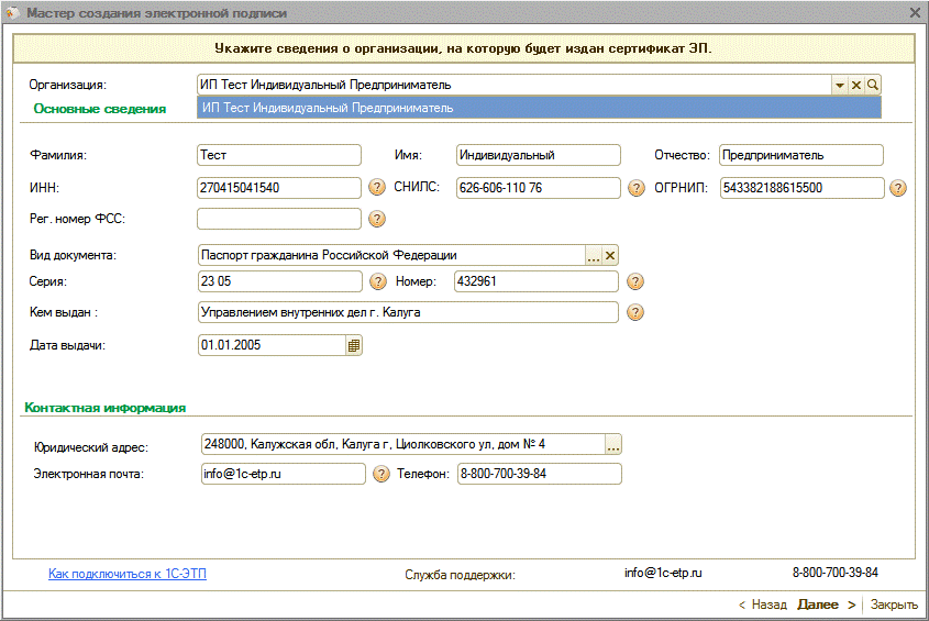 Ниже необходимо проверить правильность заполнения информации об индивидуальном предпринимателе и, в случае необходимости, заполнить дополнительные поля (рис. 3.2.2).