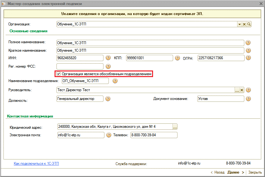 Если электронную подпись получает обособленное подразделение необходимо проставить отметку «Организация является обособленным подразделением» и заполнить дополнительное поле «Наименование подразделения» (рис. 3.1.3.). В поле указывается сокращенное наименование подразделения согласно «Положению об обособленном подразделении» или «Уведомлению о постановке на учет в налоговом органе», максимальное допустимое количество символов – 64 (включая пробелы и специальные знаки).