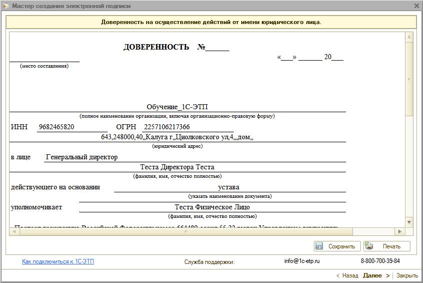 В случае если владельцем сертификата ключа проверки электронной подписи от имени юридического лица будет выступать сотрудник организации на следующем шаге «Мастером получения электронной подписи» дополнительно сформируется бланк Доверенности на осуществление действий от имени юридического лица (рис.3.1.12.).