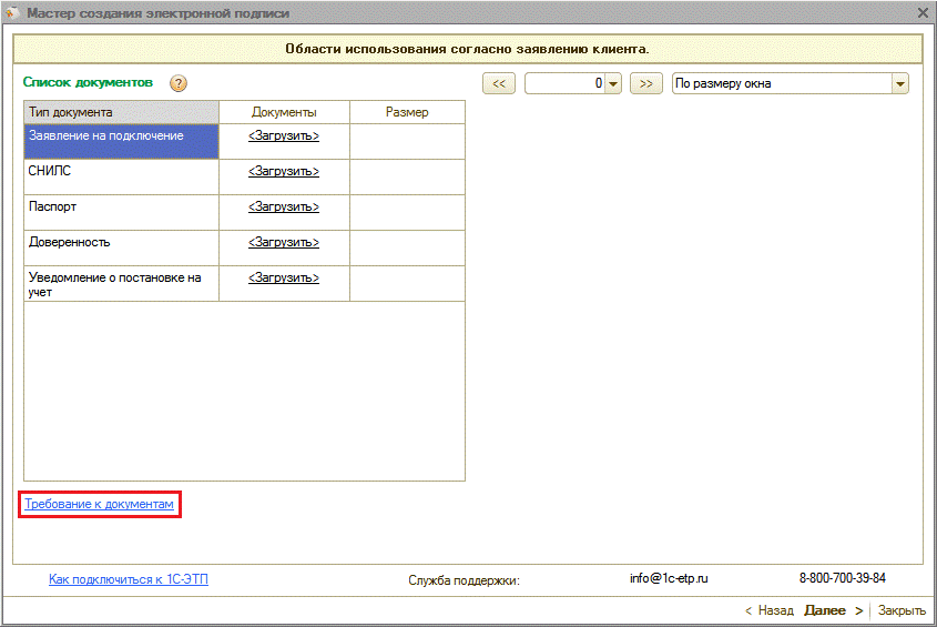Для получения электронной подписи необходимо сформировать и отправить заявление из ПП «1С-ЭТП» с помощью «Мастера получения электронной подписи».