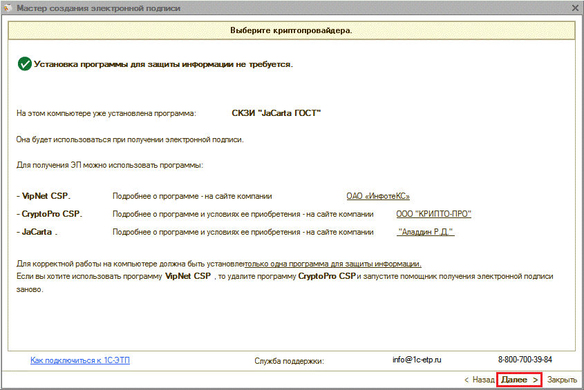 «Мастер получения электронной подписи» определит какое средство криптографической защиты информации (СКЗИ) установлено на Вашем компьютере (рис. 3.5.4.).