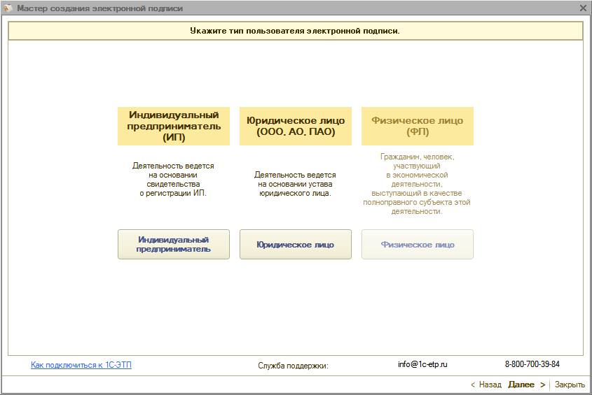 Откроется шаг выбора типа пользователя электронной подписи (рис. 3.5.6.). Отметьте выбор нажатием на соответствующую кнопку, для перехода к следующему шагу нажмите кнопку «Далее».