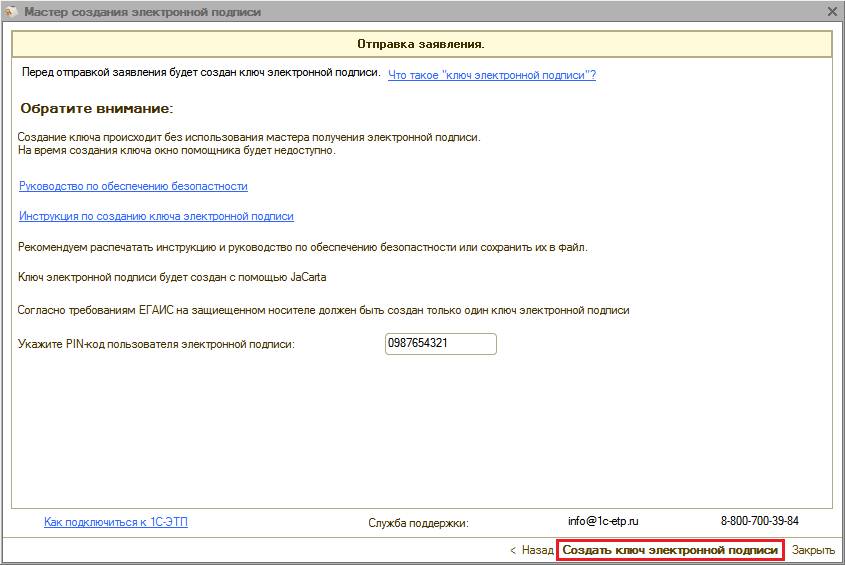 На этом шаге Вам будет предложено создать ключ электронной подписи. Ознакомьтесь с инструкцией по созданию ключа электронной подписи и с руководством по обеспечению безопасности использования электронной подписи и средств электронной подписи. В инструкции по созданию ключа электронной подписи содержится информация о стандартных паролях пользователя и администратора защищенного носителя JaCarta PKI/ГОСТ/SE. Введите PIN-код пользователя и после этого нажмите кнопку «Создать ключ электронной подписи» (рис. 3.5.7.).