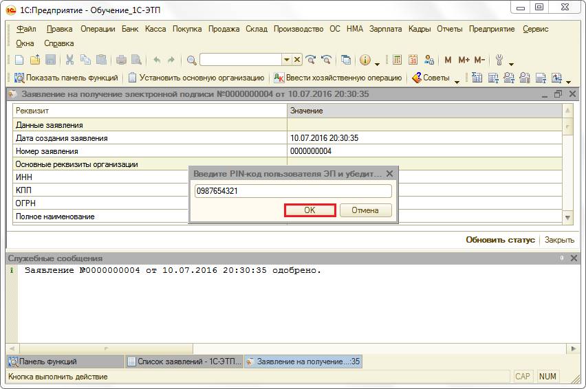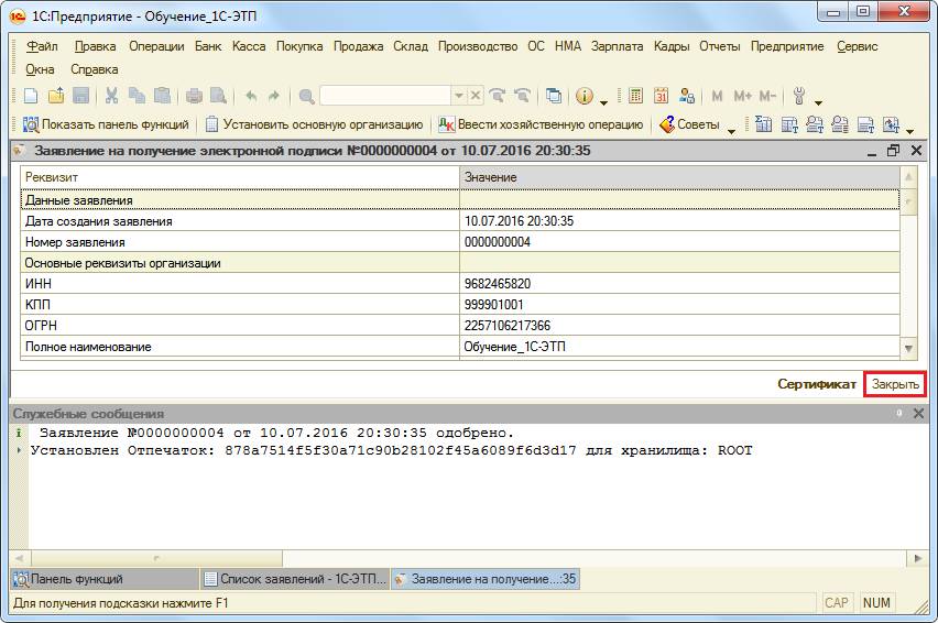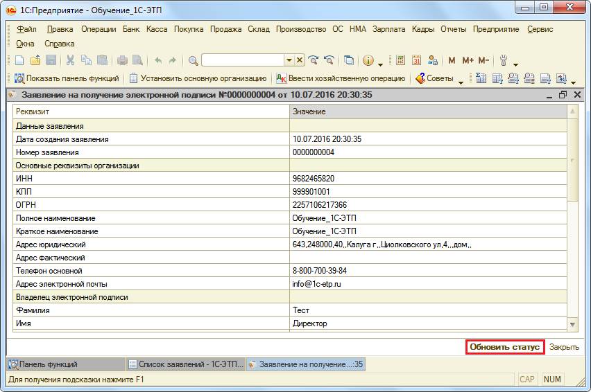 Для получения электронной подписи необходимо сформировать и отправить заявление из ПП «1С-ЭТП» с помощью «Мастера получения электронной подписи».