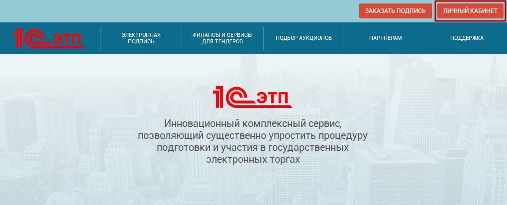 Для входа в личный кабинет перейдите на онлайн-портал по ссылке 1c-etp.ru. Перед Вами откроется главная страница портала, нажмите кнопку «Личный кабинет» (рис. 2.1.).