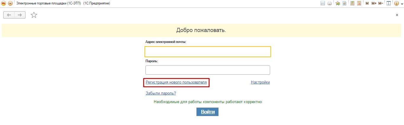 При первом входе в личный кабинет «1С-ЭТП» необходимо произвести настройку браузера и установить плагины согласно Приложению 1. После корректной настройки рабочего места необходимо зарегистрироваться в сервисе, для этого перейдите по ссылке «Регистрация нового пользователя» (рис. 2.2.).