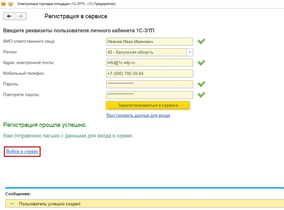 По окончании регистрации появится подтверждающее сообщение, для входа в сервис нажмите на ссылку «Войти в сервис» (рис.2.4.).