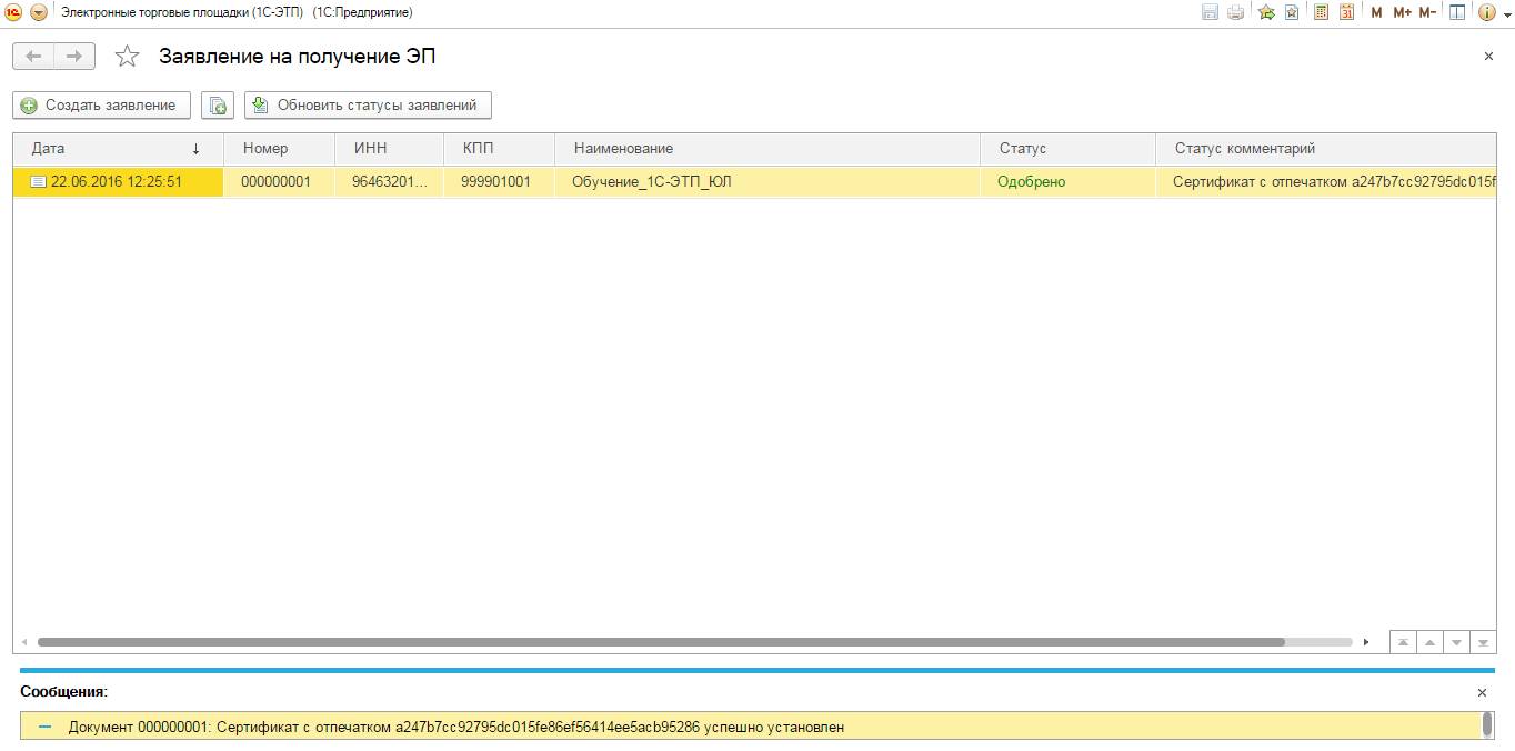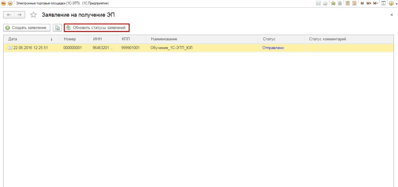 Для проверки результата обработки заявления на получение сертификата электронной подписи необходимо нажать кнопку «Обновить статусы заявлений» (рис. 3.4.1.).