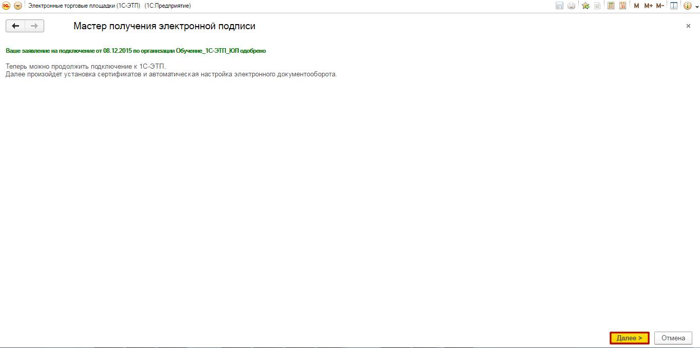 В случае успешной обработки отобразится служебное сообщение (рис. 3.4.2.), чтобы продолжить подключение нажмите кнопку «Далее».