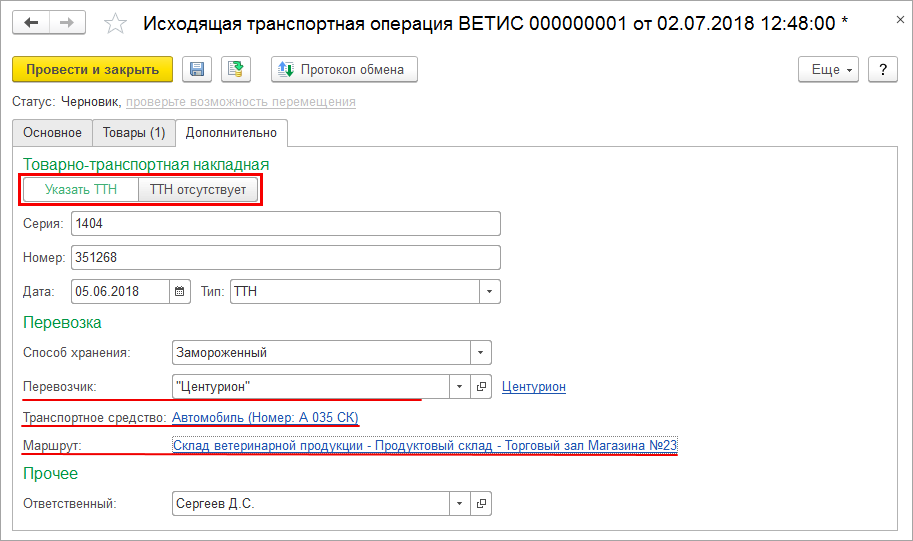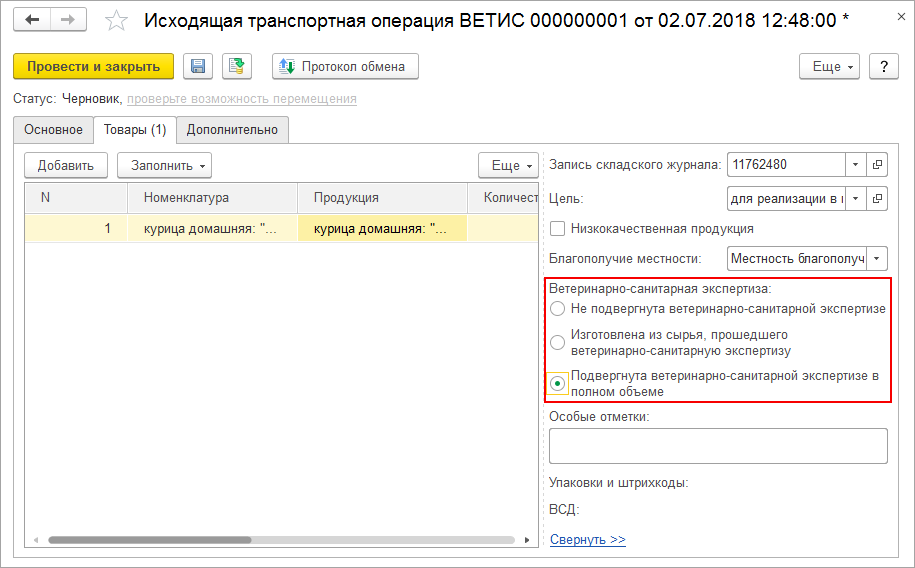 Заполнение документа Исходящая транспортная операция ВЕТИС