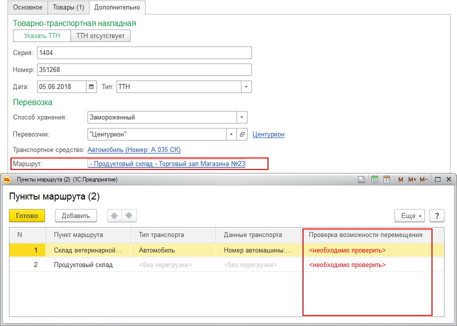 Если перемещение разрешено с условиями, то в документе напротив каждой партии продукции и каждого маршрута продукции будет