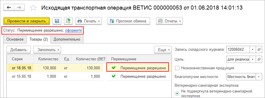 то необходимо подтвердить условия перемещения. - Перемещение разрешено — дано разрешение на перемещение продукции ВЕТИС. Если перемещение разрешено, то в документе